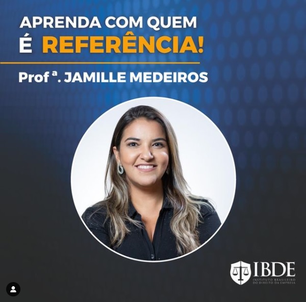 "A professora Jamille Medeiros é administradora judicial, mestre e doutora em Direito pela Universidade Federal Fluminense (UFF) e integra o renomado quadro de docentes do IBDE.