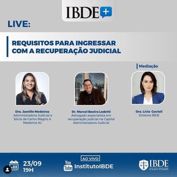 Nesta edição, teremos a presença da Administradora Judicial e sócia da nossa Mantenedora Carlos Magno & Medeiros, Drª Jamille Medeiros; e do nosso ex-aluno e Advogado, Especialista em recuperação judicial Dr. Marcel Lodetti; que debaterão os "Requisitos para Ingressar com a Recuperação Judicial". A mediação será realizada pela nossa diretora Drª Lívia Gavioli.
